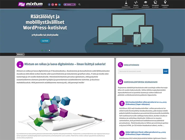 Mixtum.info is Mixtum's information website where you will find news and information related to Mixtum's business. This news website collects and displays also news related to other websites developed and maintained by Mixtum such as Adobe-koulutus.fi, IT-koulutus.fi and Velhon.fi