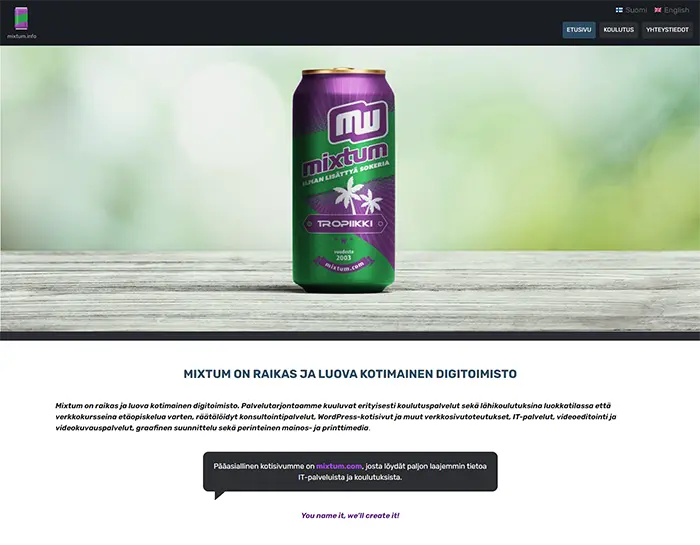 Mixtum is a fresh and creative Finnish digital agency - without added sugar. Mixtum offer digital services as well as trainings and consultation with over 20 years of experience. Mixtum is probably the best Finnish IT and AV training company. Mixtum's goal is to help the client find the best solutions and benefits from IT and AV area. The business model is based on the idea that Mixtum is able to be useful and improve the client's business possibilities, either by productions or by training and consulting.